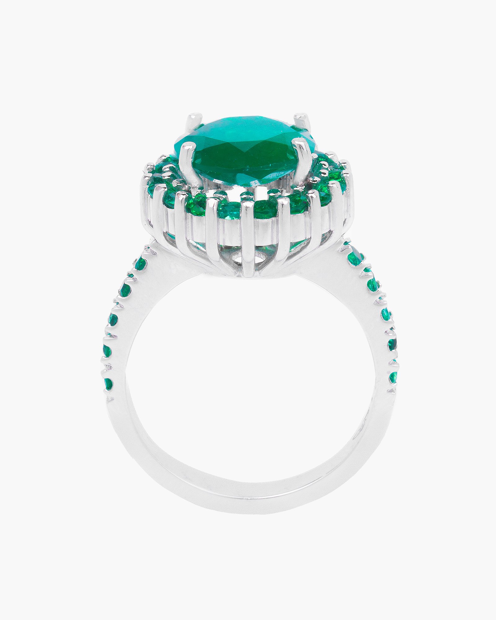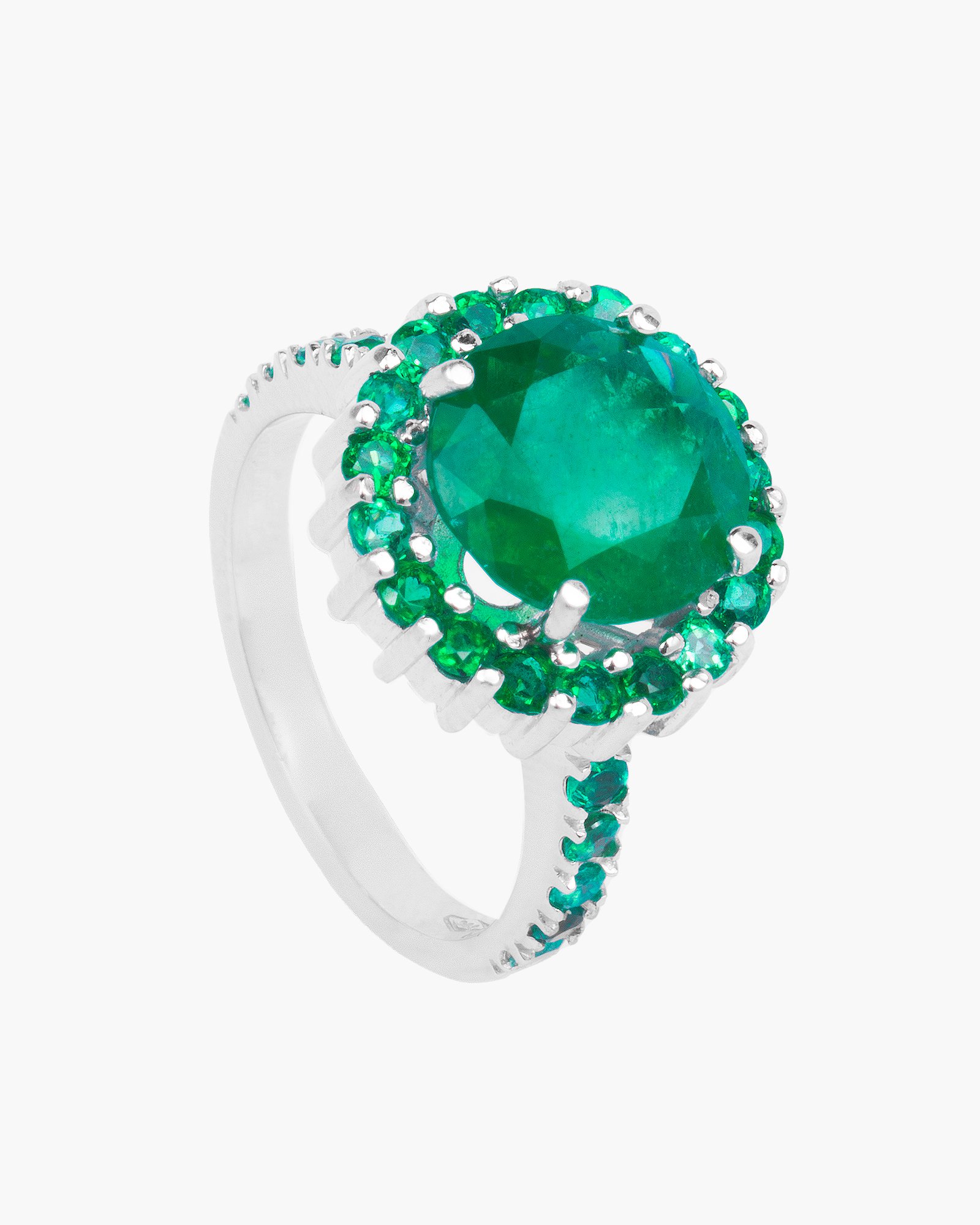 18K White Gold Ring with Round Emerald Halo Total Weight: 7.1 grams